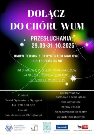 Wszystkich zainteresowanych dołączeniem do naszego zespołu, zapraszamy na przesłuchania w dniach 29.09 - 31.10.2025, po telefonicznym lub mailowym kontakcie z dyrygentem. O szczegółach przesłuchania i korzyściach płynących z członkostwa w naszym chórze, przeczytacie w zakładce Wstąp do nas.